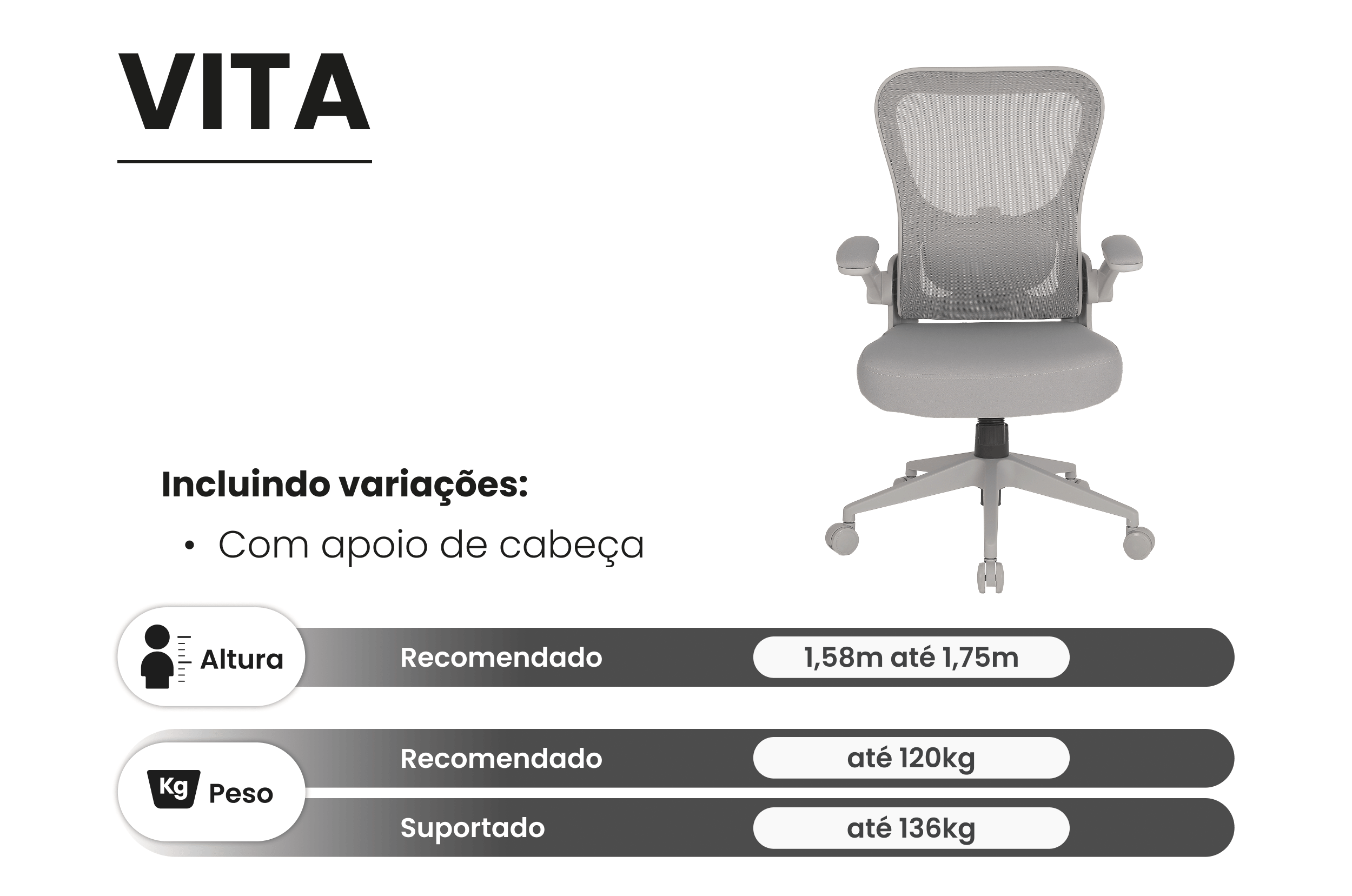 O assento da Vita é um diferencial de mercado, o mais espesso da categoria, recebe 100% de espuma injetada que preenche toda a sua forma, oferecendo uma sensação de uso superior e sem desgastes no material com o passar do tempo.