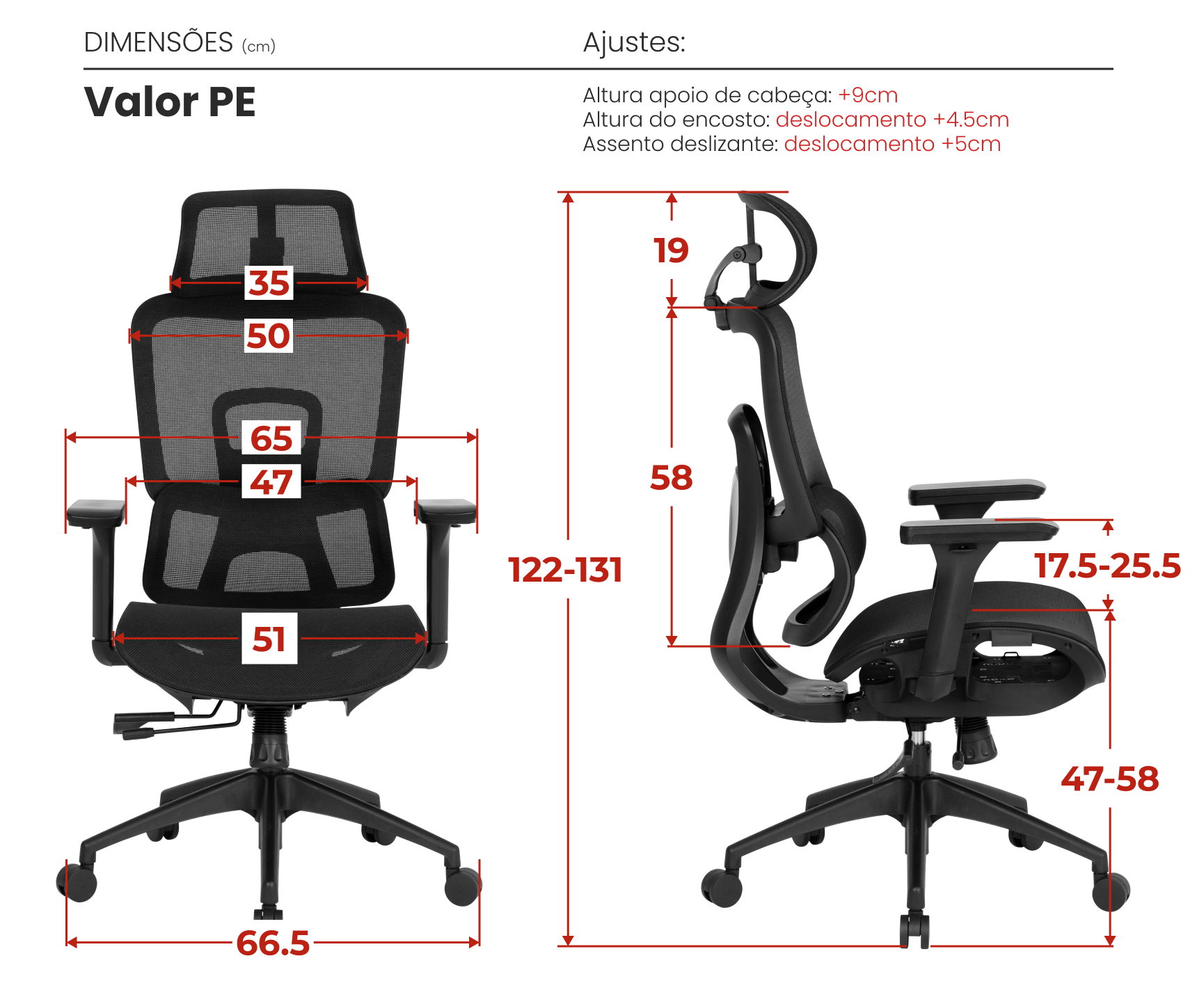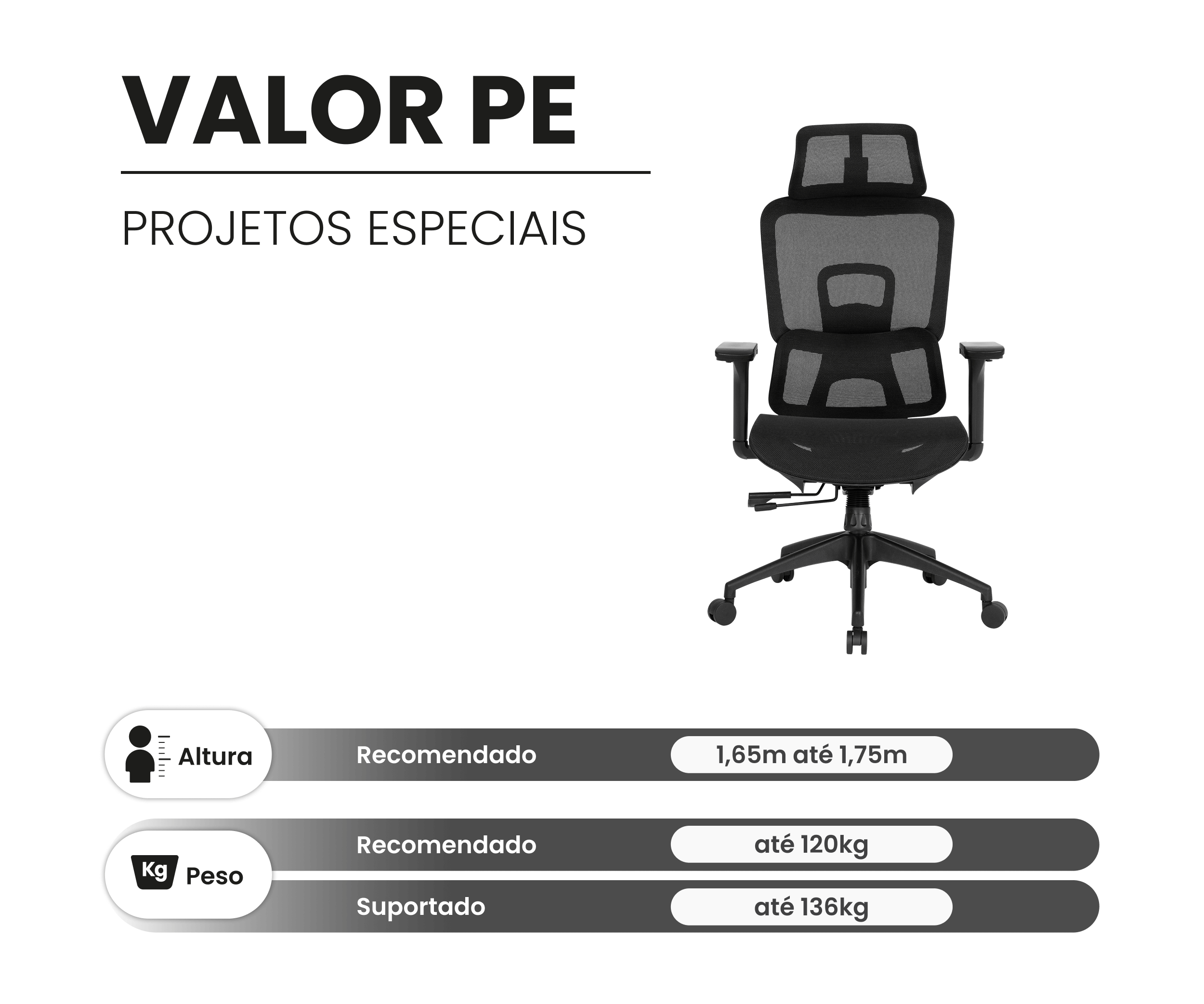 A Valor PE eleva o padrão da categoria ao entregar ergonomia real por um preço acessível. Seu design foi pensado para manter o corpo alinhado através de ajustes essenciais, em uma estrutura eficiente e uma experiência ergonômica completa. Torne a sua rotina de trabalho mais leve sem um grande investimento: a escolha mais inteligente para quem busca produtividade de verdade.