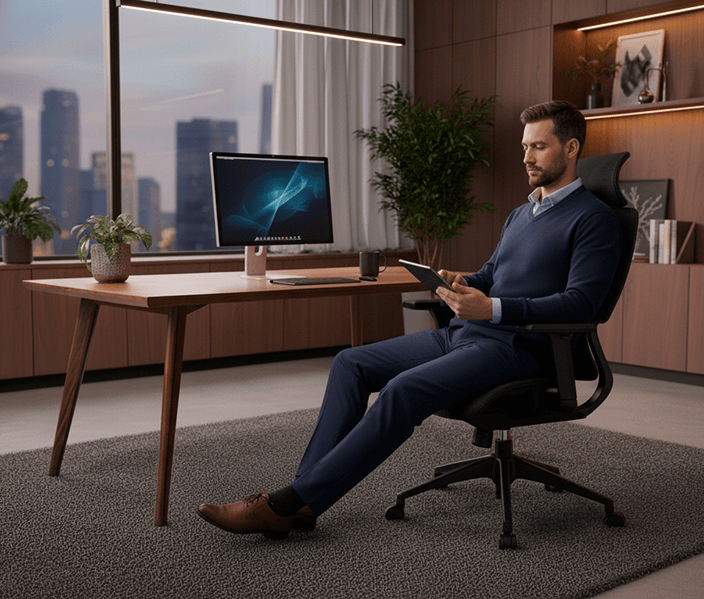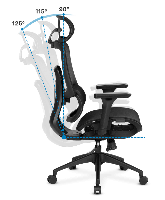 Com três níveis de reclino entre 90° e 125° e balanço suave até 125°, você alterna entre trabalho, pausa ativa e descanso leve sem deixar o ambiente. Tudo pensado para acompanhar o seu ritmo, sem perder a ergonomia.