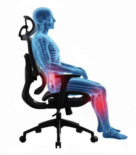 A aproximação adequada do encosto reduz a tensão lombar, garantindo apoio completo e alinhamento postural.