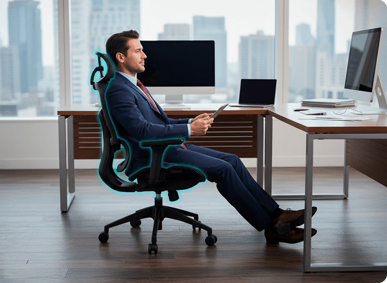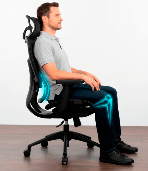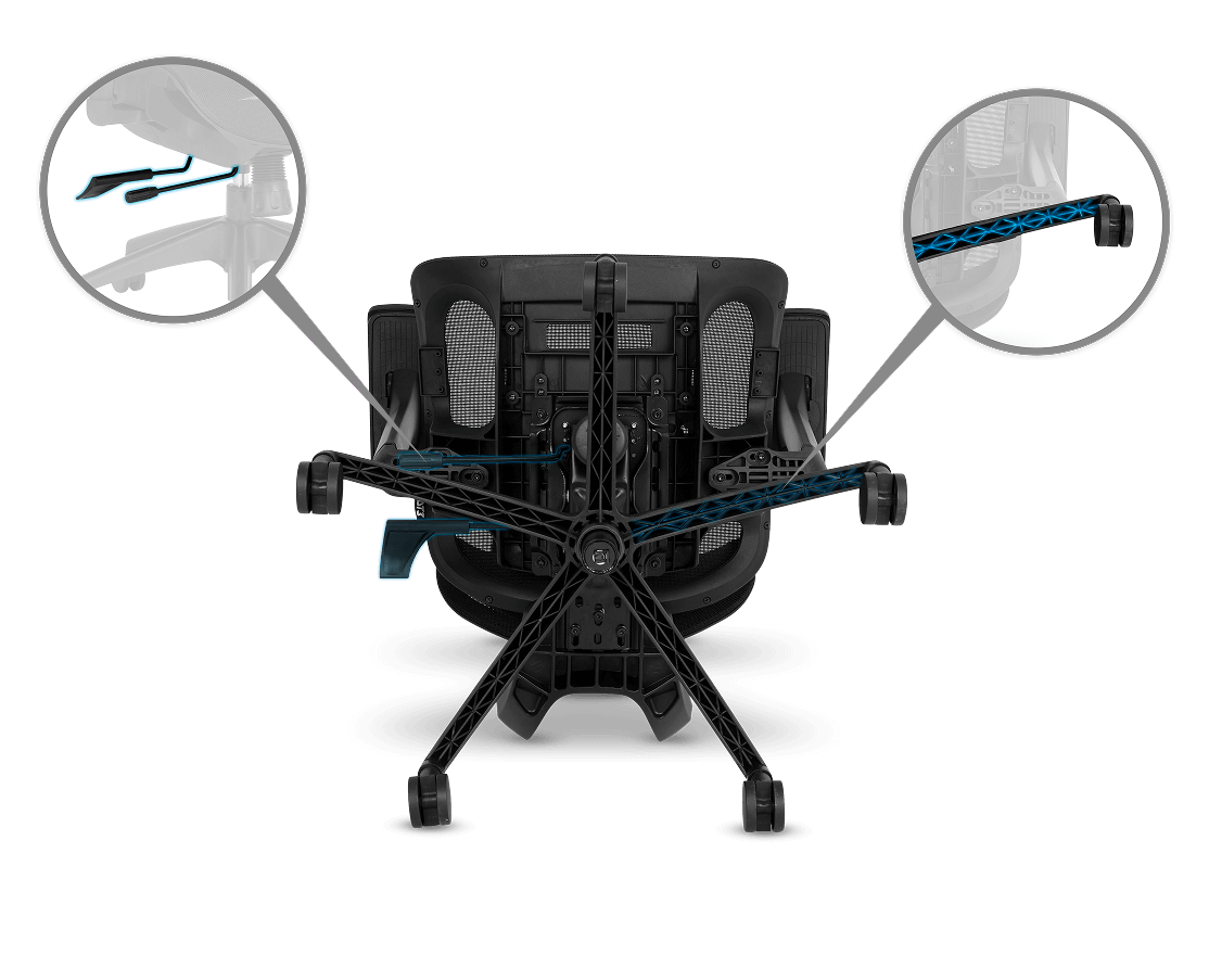 O encosto bipartido acompanha seus movimentos, o apoio lombar mantém a postura ideal sem desconforto ou resistência, e o assento Waterfall reduz a pressão nas pernas.